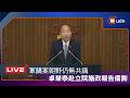 | 04.24Fri 軍購案朝野仍無共識 卓榮泰赴立院施政報告備詢 | 04.23Thu 韓國瑜召集朝野黨團協商 軍購條例朝野再交鋒 | |||